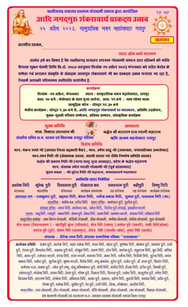 रायपुर 24 अप्रैल 2023/ छत्तीसगढ़ सनातन दशनाम गोस्वामी समाज की प्रांतीय इकाई द्वारा बैशाख शुक्ल पंचमी तिथि तदनुसार 25 अप्रैल को महादेवघाट रायपुर में आदि गुरु शंकराचार्य जयन्ती उत्सव का आयोजन किया गया है, जिसमें प्रदेश भर से गोस्वामीजन बड़ी संख्या में उपस्थित होंगे।