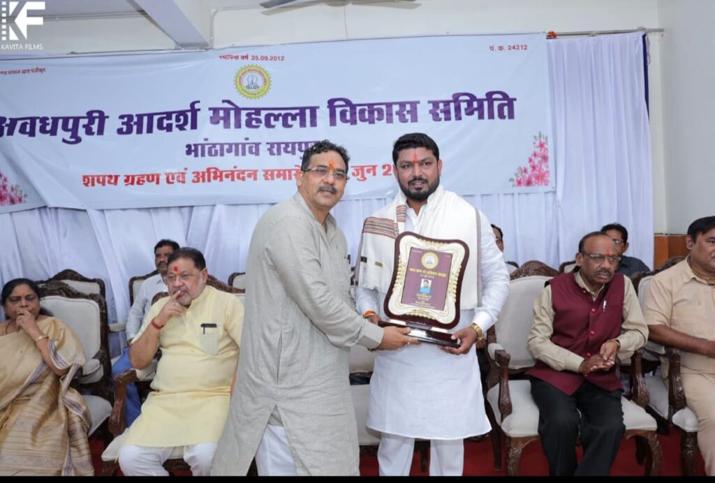 दिनांक 22 जून 2025 को अवधपुरी आदर्श मोहल्ला विकास समिति भाटागांव रायपुर के नवनिर्वाचित पदाधिकारी का शपथ ग्रहण एवम अभिनंदन समारोह गरिमामई रूप से संपन्न।रायपुर दक्षिण के विधायक सुनील सोनी मुख्य अतिथि उपस्थित हुए। रायपुर-- अवधपुरी आदर्श मोहल्ला विकास समिति भाटागांव रायपुर के आगामी 3 वर्ष के कार्यकाल हेतु नवनिर्वाचित पदाधिकारी का शपथ ग्रहण एवं अभिनंदन कार्यक्रम दिनांक 22 जून 2025 दिन रविवार को स्थान शिवम अकादमी स्कूल, ढेबर सिटी रोड,अवधपुरी,भाटागांव रायपुर में समय दोपहर 12:00 आयोजित हुई ।। अवधपुरी आदर्श मोहल्ला विकास समिति भाटागांव रायपुर के सचिव डॉ. जितेंद्र सिंह ठाकुर ने बताया 25 .09. 2012 से समिति मोहल्ले के विकास के लिए, मोहल्ले के निवासी के हितार्थ, मोहल्ले की समस्याओं का निराकरण करते आ रहा है ।। शपथ ग्रहण कार्यक्रम में नवनिर्वाचित अध्यक्ष शिवरतन गुप्ता द्वारा मोहल्ले के वरिष्ठ नागरिक कीर्ति भाई सोनी, राम मंदिर अवधपुरी के पुजारी श्रीवास्तव जी, पंडित निलेश तिवारी, वर्षा प्रोविजन स्टोर्स के संचालक, खोरबाहरा राम साहू पूर्व अध्यक्ष, कृष्ण ध्रुव पूर्व अध्यक्ष को साल एवं श्रीफल से सम्मान किया गया ।। कार्यक्रम के मुख्य अतिथि रायपुर दक्षिण के विधायक मा. सुनील सोनी, विशिष्ट अतिथि श्री योगेश अग्रवाल पूर्व अध्यक्ष राइस मिल एसोसिएशन, श्री राजकुमार राठी भाजपा प्रवक्ता, श्री अवतार भारती बागल अध्यक्ष राजस्व रायपुर नगर निगम,, श्री प्रभात मिश्रा प्रदेश संयोजक अखिल भारतीय साहित्य परिषद, श्री राजेश मिश्रा पत्रकार आईबीसी 24, श्री रवि सोनकर पार्षद भाटागांव रायपुर, श्री श्याम गुप्ता संचालक शिवनाथ महिंद्र ऑटोमोबाइल, श्री विनोद पांडे संचालक शिवम अकादमी स्कूल, श्रीमती मोनिका साहू पूर्व पार्षद भाटागांव, श्री सतनाम सिंह पनाग पूर्व पार्षद तथा समिति की संरक्षक सुश्री रेखा सिंह रही ।। कार्यक्रम का शुभारंभ सर्वप्रथम भगवान राम की पूजा पाठ आरती पंडित नितेश तिवारी जी द्वारा कर मुख्य अतिथि के हाथों दीप प्रचलित किया गया ।। अतिथियों का सम्मान एवं उद्बबोधन हुआ।। तत्पश्चात आगामी 3 वर्षीय कार्यकाल हेतु नवनिर्वाचित पदाधिकारी का शपथ ग्रहण मुख्य अतिथि सुनील सोनी एवं समिति की संरक्षक तथा सेवानिवत्ति अपर कलेक्टर सुश्री रेखा सिंह मैडम द्वारा कराया गया । शपथ ग्रहण कार्यक्रम में प्रमुख रूप से नवनिर्वाचित अध्यक्ष शिवरतन गुप्ता, उपाध्यक्ष बी आर धनगर, सचिव डॉक्टर जितेंद्र सिंह ठाकुर, कोषाध्यक्ष देवेंद्र कुमार साहू, संयुक्त सचिव परमानंद प्रसाद गुप्ता, कार्यकारिणी सदस्य अशोक कुमार बंजारे, पूनम कुमार साहू, ने शपथ ग्रहण लिया।।। कार्यक्रम में पूर्व पदाधिकारी का महत्वपूर्ण योगदान रहा. ।।। बी.आर. धनगर उपाध्यक