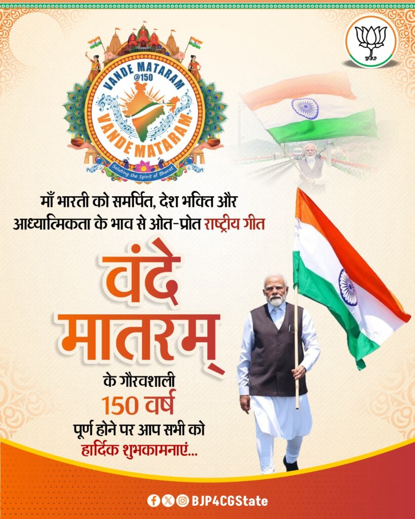 रायपुर/ 07 नवंबर 2025/ वंदे भारत गीत की रचना के आज 7 नवंबर 2025 को 150 साल हो गए. वंदे मातरम् जो कभी देश की आजादी के आंदोलनकारियों का अमर वाक्य रहा, आज भी ये मातृभूमि के लिए हमारे अटूट प्रेम की ये निशानी है. वंदे मातरम् का पहली बार बंगदर्शन में 7 नवंबर 1875 को प्रकाशन हुआ था. बंकिम चंद्र चट्टोपाध्याय ने 1882 में इसे आनंदमठ में प्रकाशित किया. राष्ट्रगान जन गण मन के रचनाकार रवींद्रनाथ टैगोर ने इसे संगीत के सुरों में पिरोया था. एक कविता से राष्ट्रीय गीत बनने की वंदे मातरम् की यात्रा कभी न भूलने वाली है… आइए जानते हैं वंदे मातरम का इतिहास…