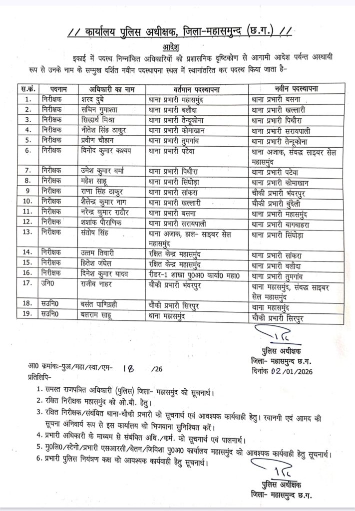 महासमुंद 03 जनवरी 2026/ जिले में पुलिस प्रशासन को और मजबूत बनाने के उद्देश्य से पुलिस अधीक्षक कार्यालय द्वारा निरीक्षकों और थाना–चौकी प्रभारियों की नई स्थानांतरण सूची जारी की गई है। यह आदेश प्रशासनिक कारणों से अस्थायी रूप से लागू किया गया है, जिससे जिले में कानून व्यवस्था, अपराध नियंत्रण और प्रशासनिक समन्वय को बेहतर बनाया जा सके।