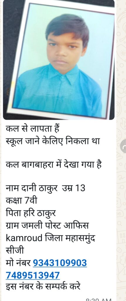 खल्लारी 16 जनवरी 2026/ खल्लारी थाना क्षेत्र के जामली पोस्ट कमरौद थाना खल्लारी जिला महासमुंद छग के कक्षा 7 वीं के छात्र दानी ठाकुर उम्र 13 वर्ष पिता हरि ठाकुर स्कूल जाने के लिए 7 जनवरी को घर से निकला था।